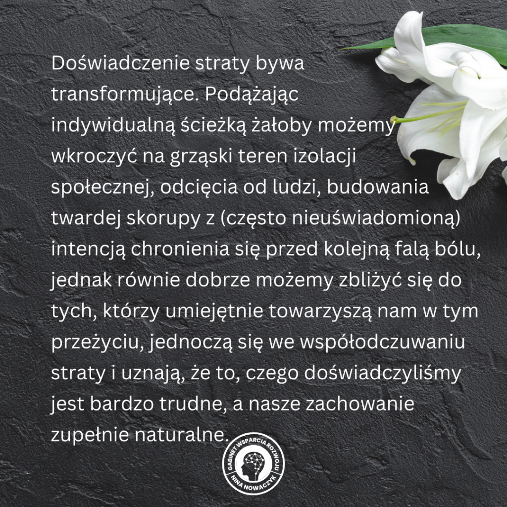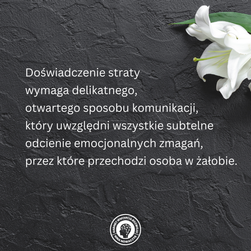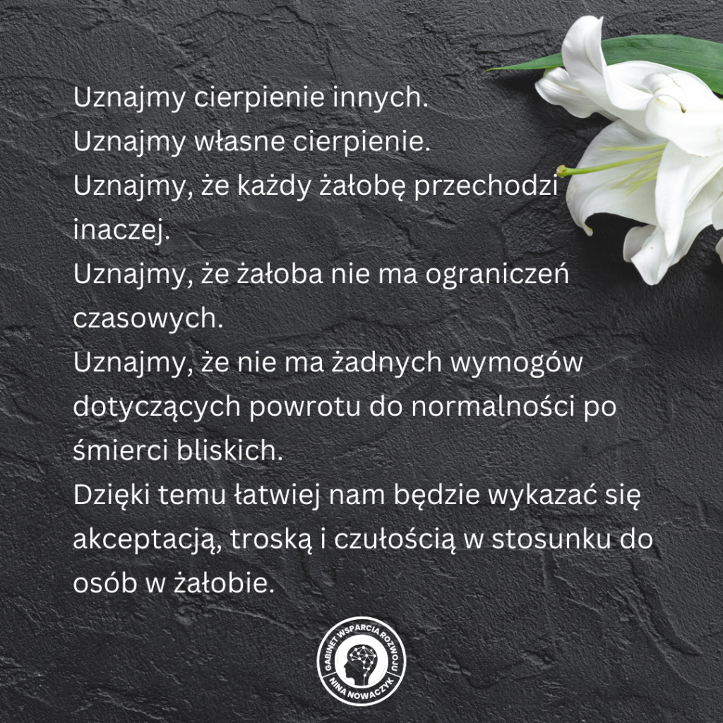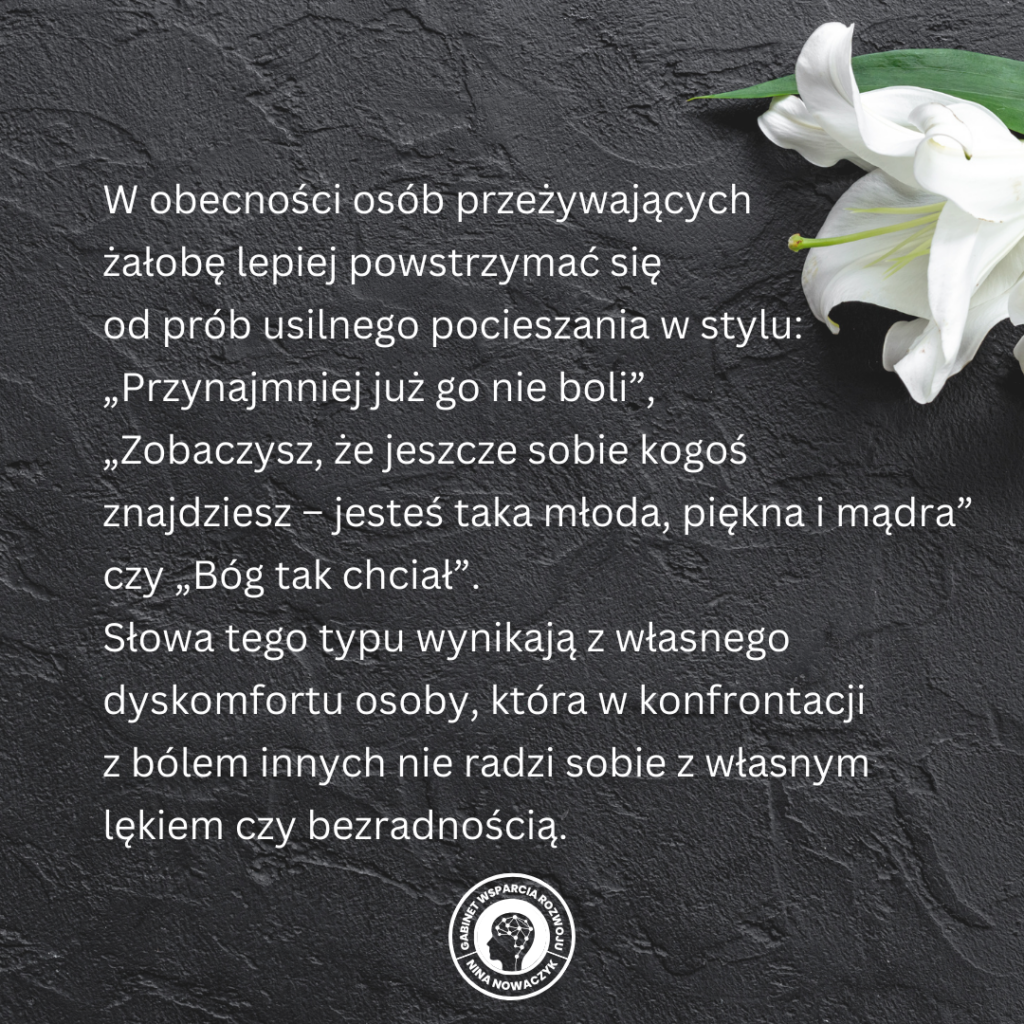 Czasami nie jest łatwo wykazać się akceptacją, troską i czułością w stosunku do osób w żałobie – często wynika to z naszego własnego dyskomfortu, bezradności, bólu, nieutulonej tęsknoty.