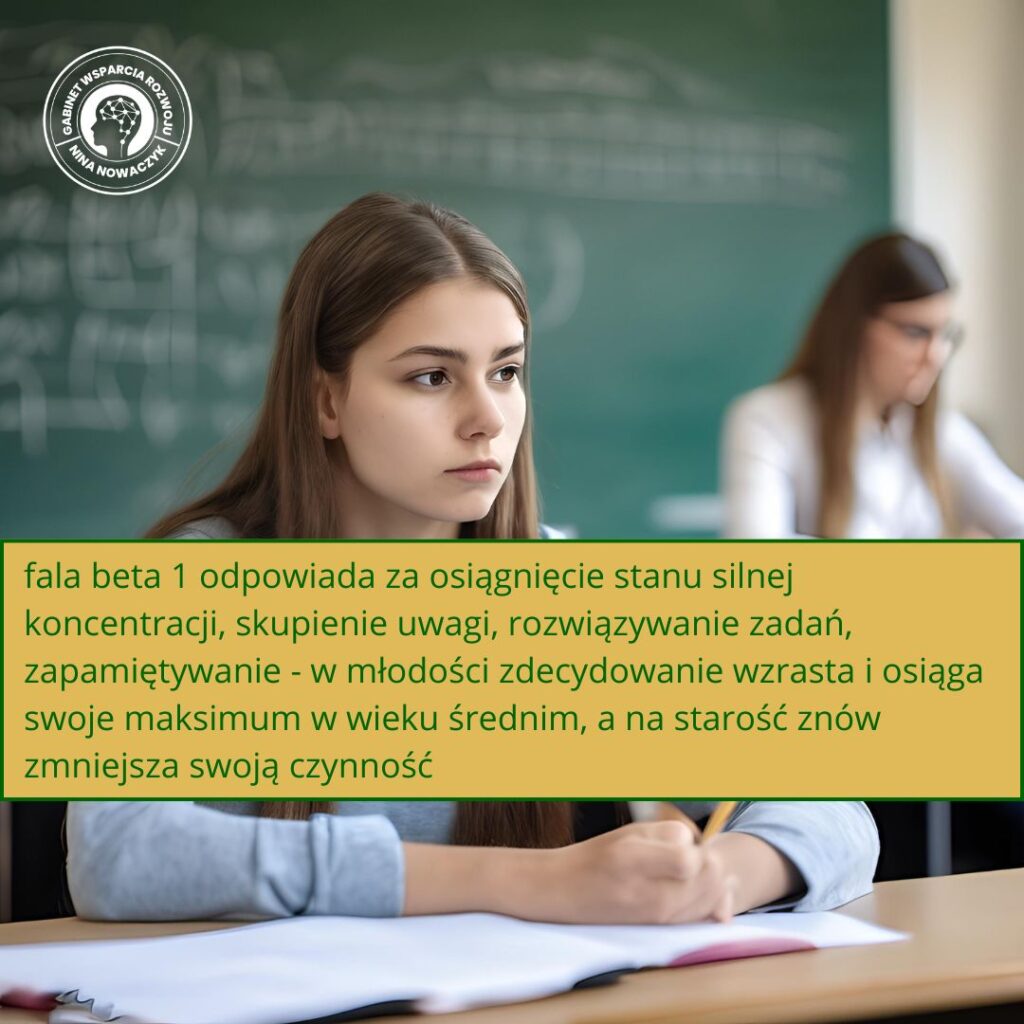 Fale beta 1 (15-19 Hz) ulegają stałym zmianom od narodzin do śmierci – na początku młodości zdecydowanie wzrastają i osiągają swoje maksimum w wieku średnim, by na etapie jesieni naszego życia znów zmniejszać swoją czynność. Nic dziwnego, gdyż odpowiadają one za osiągnięcie stanu silnej koncentracji, skupienie uwagi, rozwiązywanie zadań, zapamiętywanie.